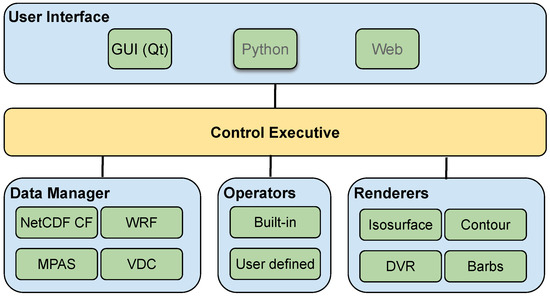 VAPOR software component diagram. The Control Executive marshals data and commands between the User Interface, and the other three primary components: Data Manager, Operators, and Renderers. The components in gray (Python and web) are still yet to be developed.