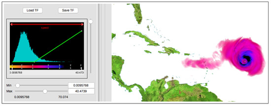 A screenshot of VAPOR. The left panel shows the interface of a transfer function editor, and the right panel shows a visualization of a simulation of 2009’s Hurricane Bill in the Caribbean sea of the Atlantic. The visualization is a volume rendering of the horizontal wind speed of Bill on top of an image rendering of the Earth in the same region. The transfer function specified on the left is applied to the volume rendering (but not image rendering) on the right.