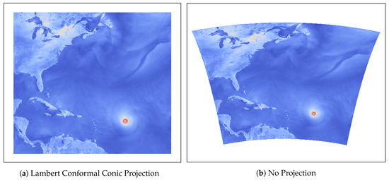 2D pseudocolor rendering of 2009’s Hurricane Bill simulation using VAPOR with Lambert conformal conic projection enabled (a) and disabled (b). The rendered variable is friction velocity (UST), and the data are in WRF format.