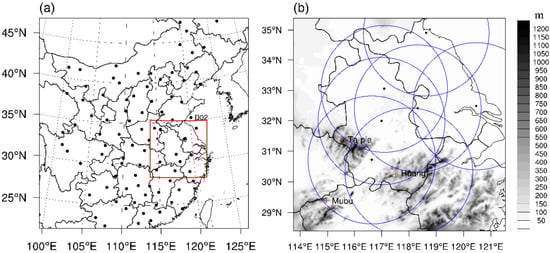 An observing system simulation experiment (OSSE) framework was employed to initialize the ensembles [53,54,55]. The ‘true’ atmospheric state was represented by a 36 h nature run initialized 24 h before the analysis time for each case with a 3-km resolution over the outer domain. Thereafter, for the outer domain, mesoscale sounding datasets were created at locations within mainland China (Figure 1a) and were interpolated from the ‘true’ run while considering observational error. For the inner domain, the ‘true’ run was interpolated to seven real radar locations (Figure 1b) considering observational error (reflectivity and radial wind) in order to create radar datasets. The horizontal and vertical covariance localization radii for the sounding datasets (radar data) in the outer (inner) domain were set to 120 km and 6 km (20 km and 5 km), respectively. Additionally, to maintain the ensemble during DA cycles, a multiplicative covariance inflation of 0.15 [56,57] and a relaxation inflation of 0.5 [58] were applied to the outer and inner domains, respectively; these values were chosen based on sensitivity tests to provide the best ensemble spread.
