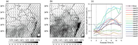 Figure 2c shows the evolution of as a function of forecast time for 14 Meiyu season heavy rainfall events with a 6 h reference line. Values of are generally between 0 and 16 h, and most cases are characterized with a threshold of 6 h. However, for some events, is close to 6 h during the 12 h forecasting period, indicating that there is no definite boundary between the two subsets in this study. Therefore, the events were simply categorized by the time-averaged value of .