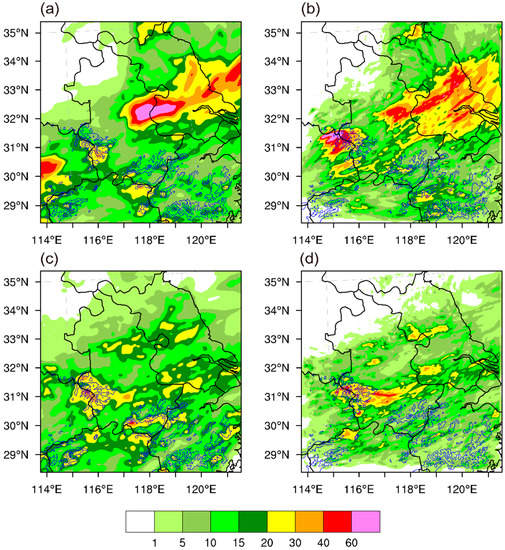 Figure 3 shows the case-averaged spatial distribution of 12 h accumulated precipitation for observation and control forecasts for SF and WF events. In the SF phase (Figure 3a), a clear rainbelt oriented southwest–northeast is apparent along the Meiyu front (shown by the gray areas in Figure 2a), with the precipitation centers located near the border of Jiangsu and Anhui provinces (32.5° N, 119° E). In contrast, the total precipitation for WF events (Figure 3c) shows a multi-core feature in which local precipitation maxima are located along heterogeneous and steep lower latitude terrains, such as Tapie Mountain (31° N, 116° E), Huang Mountain (30° N, 117.5° E) and Mubu Mountain (29.5° N, 115° E). This result is consistent with the features of warm-sector convective events described by Chen et al. [68]. The wind field also differs between SF and WF events, with WF events generally characterized by weaker large-scale advection (Figure 2a,b) in which the available convective potential energy is likely to rise (Figure 2b). These large-scale features are in accordance with recent work by Klasa et al. [69], thus confirming the use of in this study.