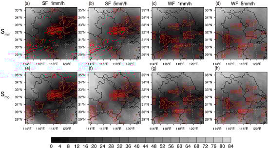 Case-averaged spatial distribution of (a–d) Smm and (e–h) Smo averaged over the 1–12 h lead time for (a,b,e,f) SF events and (c,d,g,h) WF events, with precipitation thresholds of (a,c,e,g) 1 mm/h and (b,d,f,h) 5 mm/h. The red contours show the case-averaged 12 h accumulated precipitation which is indicative of moist areas.
