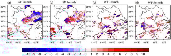 Case-averaged spatial distribution of [Smm–Smo] averaged over the 1–12 h lead time for (a,b) SF events and (c,d) WF events, with precipitation thresholds of (a,c) 1 mm/h and (b,d) 5 mm/h. The red contours show the case-averaged 12 h accumulated precipitation which is indicative of moist areas.