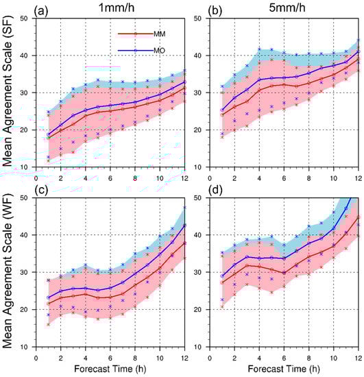 Variations of case- and domain-averaged Smm (red line) and Smo (blue line) for (a,b) SF events and (c,d) WF events, with precipitation thresholds of (a,c) 1 mm/h and (b,d) 5 mm/h. The shaded areas represent the standard deviations of different events within certain categories; the red and blue shaded areas represent Smm and Smo, respectively.
