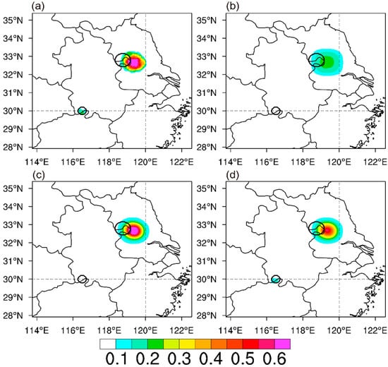 The value of the EAS (including Smm and Smo) varies from 0 to Slim (a predetermined maximum scale [15]; in this study, Slim was set to 80) until the criterion is met. Subsequently, member–member comparisons were calculated to retrieve the mean value for . In this study, the pairs for Smm (i.e., the mean agreement scale among ensemble members) was [15,31], where N is the number of ensemble members, and there were N pairs for Smo (i.e., the mean agreement scale between ensemble forecasts and observation). Following Blake et al. [31], α was set as 0.5 to meet a moderate difficulty to satisfy a smaller radius. Moreover, to meet a potential guidance for the subsequent probabilistic forecast, in this study we directly calculated the EAS for certain incidents (i.e., with certain thresholds).