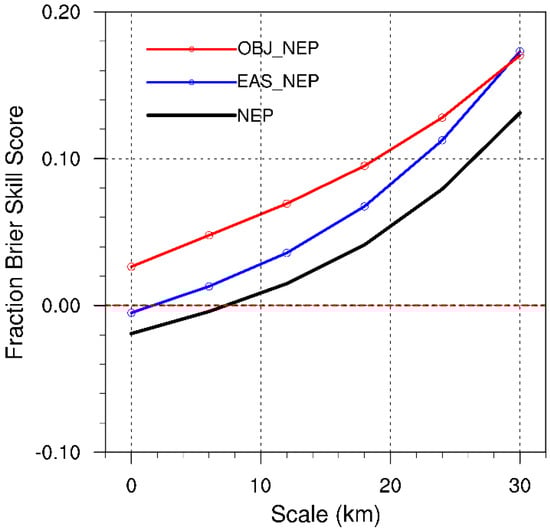 Graphs of Fractions Brier Skill Score (FBSS) as a function of spatial scale (km) for the NEP (black curve), EAS_NEP (blue curve), and OBJ_NEP (red curve) approaches for the idealized experiment. GP was used as the reference forecast.