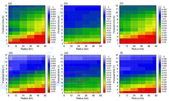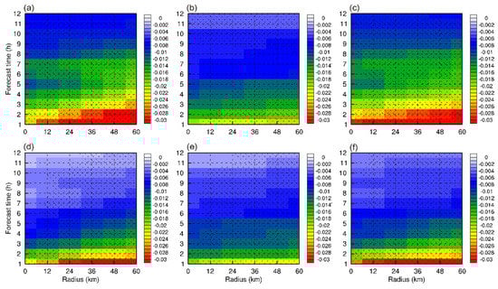 Plots of FBS as a function of horizontal scale and forecast lead time were created for precipitation thresholds of 1 mm/h and 5 mm/h under SF and WF, respectively (Figure 9). The corresponding probability of observation was generated for spatial scales of 0, 12, 24, 36, 48, and 60 km. In general, all of the spatial-based methods showed clear advantages over the traditional GP method, with most of the areas passing the 85% significance level. These advantages are basically related to early lead times with larger spatial scales, due to the fact that the dispersion for ensemble members is generally lower at early lead times, when the spatial-based probability captures more spatial uncertainties (this could also explain the advantages at larger scales) without apparent decay at high-confidence probabilistic centers. However, at later lead times, with the consistent growth of initial error characterized by moist convection and large-scale flow [70], the ensemble members gradually evolve in different directions, leading to lower probabilistic values. Under such circumstances, the effect of added uncertainties extracted with spatial-based methods is clearly reduced [31].