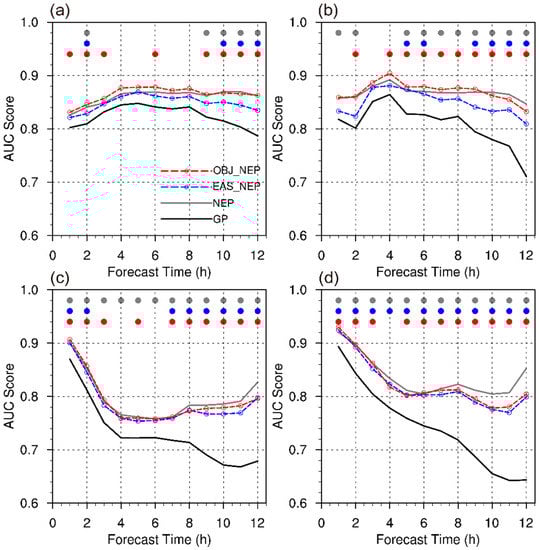 Furthermore, the AUC score was analyzed as a function of forecast lead time (Figure 11) in order to evaluate the discriminatory ability of GP, NEP, and the two mutative-scale methods. Generally, except for GS at later forecast lead times (Figure 11c,d), the AUC scores for both probabilistic forecasts were greater than 0.7, indicating “useful” forecasts [17]. Moreover, the AUC scores decreased with time, representing the decrease of predictability with consistent error growth.