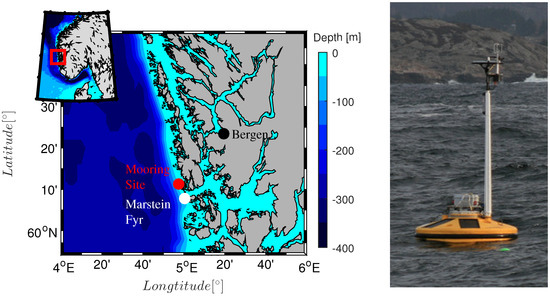 (Left) Site map of the Bergen area showing the locations both of Marstein Fyr and the mooring site on the southwestern coast of Norway. (Right) The Fugro Seawatch Wavescan buoy deployed at the measurement site. A Gill R3-100 ultra-sonic anemometer and a Crossbow NAV440 IMU system were attached to the buoy’s mast, approximately 4 m above the sea surface.