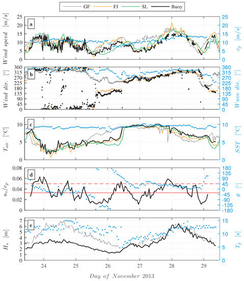 The corresponding wave conditions during the field campaign, i.e., wave phase speed (), wave direction, sea surface temperature (SST), relative angle between the wind and the swell waves, and the wave peak period () are shown on the left ordinate axes of Figure 3. We computed the wave phase speed by using the average wave period, found from an approach known as “zero crossing” [32]. All other wave parameters were either recorded directly by the Wavescan buoy sensors or computed by the internal Wavescan buoy software.