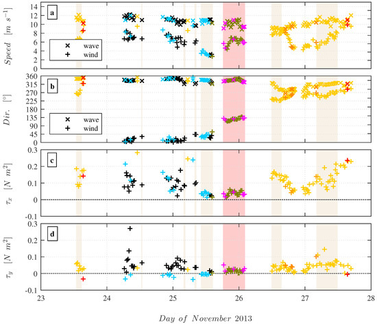 Figure 4 shows the time series of the wind speed and wave phase speed, the wind and wave direction and the along-wind and cross-wind wind stress measured in the orthogonal coordinate system. The color of the data points corresponds to seven observed combinations of the wind stress components and , which are presented in Section 4.2. Time periods associated with cross-swell and counter-swell situations are indicated by the light grey and dark grey shading, respectively.