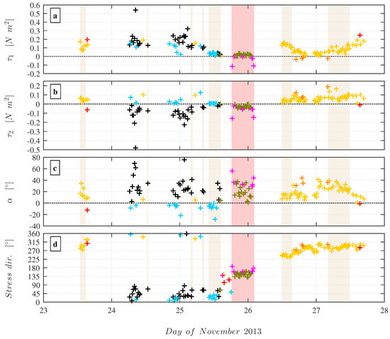 The stress vector arrangement of Case 1 is typical for situations with moderate to strong winds [20], in which and . Both and are positive and the resulting stress vector is situated in the acute angle created by the wind and swell propagation direction, to the right of the wind vector. Consequently, the corresponding stress vector components and can only be positive. This case was observed at the beginning and from the second half of the deployment period (data runs shown in yellow). The inverted situation, Case 2, occurs when and . In this case, the cross-wind stress is negative while and remain positive. This situation was observed during 24–26 November (data runs shown in blue).