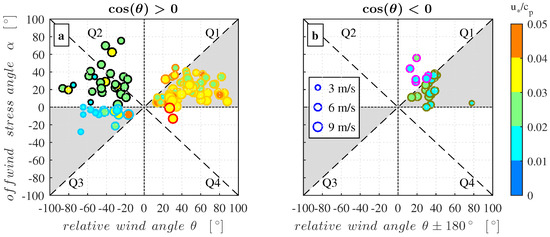 The size of the off-wind angle is directly related to the magnitude of the stress vector components. A comparison between the wind stress aligned with the wind () and the swell waves direction () is shown in Figure 8. The majority (77%) of the data runs associated with wind-following and cross-swell conditions () are located within the shaded area in the upper two quadrants of Figure 8a. These data are typically observed for situations where , belonging to Cases 1 and 2 in Quadrant Q1, and to Cases 3 and 4 in Quadrant Q2. Note that the seemingly elongated behavior of the data points in Quadrant Q2 is a result of self-correlation in the solutions of Equation (4). As stated by Grachev et al. [20], this self-correlation can affect the relative positions of the data points within this quadrant but it cannot change the signs of and . Data runs with stress vector component are located in the white area of Quadrants Q1 (, Case 1) and Q4 (, Case 5). These data account for approximately 23% of the presented data for which , whereof approximately 80% (18% of the presented data for which ) have a stress vector that is situated within ±20° of the swell direction. For counter-swell cases (Figure 8b), data associated with the typically observed Case 6 are located in Quadrant Q2, while data belonging to Case 7 are located in Quadrant Q3. We observed that 66% of the counter-swell runs were associated with a stress vector for which (white area of Quadrants Q2 and Q3). The stress vector was situated within ±20° to the opposite swell propagation direction in 58% of the counter-swell runs.