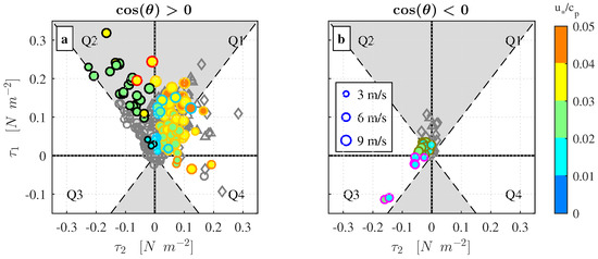 Decomposition of the stress vector in the wind-swell coordinate system for: (a) wind-following swell and cross-swell cases (); and (b) for counter-swell cases (). The dashed lines correspond to and the shaded areas indicate the sector where . The marker color indicates the inverse wave age parameter and the marker edge color corresponds to the seven wind-swell cases presented in Figure 6. The marker size indicates the wind speed in the range 3–10 m s−1, with corresponding marker reference shown in (b). For comparison with our wind stress estimates, data from three different field campaigns presented by Grachev et al. [20] (their Figures 11–13) are shown in grey: grey circles (∘) are data from SCOPE, grey triangles (△) are data from MBL II and grey diamonds (⋄) are data from COPE.