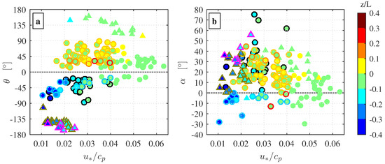 Relative angle between the wind and the swell direction (a); and off-wind angle between the stress vector and the wind vector (b) plotted as function of the inverse wave age parameter. The marker color indicates the stability parameter and the marker edge color corresponds to the seven wind-swell cases presented Figure 6. To illustrate the decreasing range of and with increasing inverse wave age, data runs associated with a complex wind sea and strong winds (typically above 10 m s−1) that were excluded from the data analysis are also shown without marker edge color. Data runs for which (wind-following and cross-swell) are shown as circles (°) and data runs for which (cross-swell and counter-swell) are shown as triangles (△).