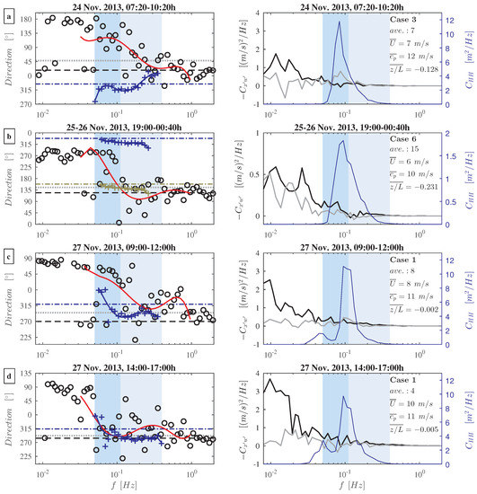 Estimates of the wind stress and wave direction for the typically observed Case 1 are presented in Figure 10c,d, which show estimates for two different 3 h time periods on 27 November. During the first time period (Figure 10c), the wave field contained waves with periods between 3 and 20 s and the average wave direction was 49° to the right of the mean wind direction. The mean net-wind stress direction had an angle of 25° to the right of the mean wind direction and was thus situated between the mean wind and average wave direction (Figure 6, Case 1). Many of the locally generated short wind waves at 0.1–0.2 and Hz appear to have been roughly aligned with the mean wind direction. Waves with frequencies of 0.1–0.2 Hz seem to have a slightly different propagation direction concurrent with the net-wind stress. Nonetheless, the estimated wave directions within this frequency band might be uncertain due to limitations in the modified PUV-approach [35]. Estimates of the wind stress direction are situated between the mean wind and the average wave direction in the frequency range of 0.2–0.35 Hz, which is similar to the observations presented by Rieder et al. [4]. Wind stress directions appears to have been more aligned towards the average wave direction for frequencies of 0.35–0.8 Hz. This might indicate the existence of non-stationary processes at the measurement site, as well as residual noise from incomplete motion correction. The estimates of both the wind stress direction and the wave direction turned clockwise within the swell wave frequency band. The fifth-order polynomial fit suggests that the turning of the wind stress direction started at a slightly higher frequency ( Hz) than the turning of the wave direction. Consequently, the relative angle between the wind and the swell waves was larger for shorter swell waves and decreased with decreasing frequency for longer swell waves.