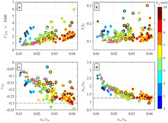 In counter-swell conditions, the wind is blowing against the waves which increases the surface drag [27,45]. Consequently, the wind stress estimates are expected to be higher than that of the wind-following swell conditions. Nonetheless, our stress estimates recorded during the counter-swell period (Figure 8b) were found to be unexpectedly low. These data runs were recorded during strong swell and wind speeds ranging 4–7 m s−1. The low wind stress values recorded during the counter-swell period would suggest that the atmospheric surface layer at the measurement height was decoupled from the sea surface, so that wind stress was not influenced by the waves. This hypothesis will be further discussed in Section 4.6.