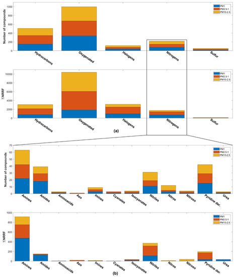 (a,b) Contextualisation of nitrogen-containing functional groups in relation to the total number of compounds tentatively identified with their associated normalised relative response factors (ƩNRRFs) of different organic (N) compounds for each of the functional group categories in the three particle size ranges (adapted from Figures 4 and 8 in Booyens et al. [29]).