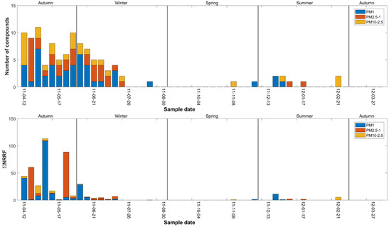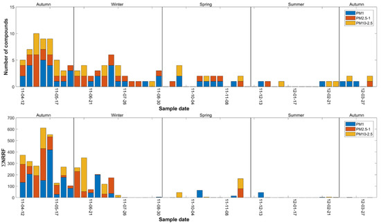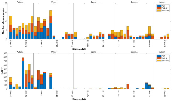 Total number of nitriles identified and their corresponding semi-quantified concentrations (ƩNRRFs) in the three particle size fractions for each sample collected.