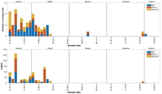 The ƩNRRFs of two specific nitrile compounds, i.e.,2,4-pentanedinitrile and cyanogen, which were also detected in other samples that were collected throughout the sampling period, were significantly higher in the PM1 size fraction in the sample collected on 10 May 2011. Cyanogen is a toxic compound, while Graedel et al. [49] indicated that the possible sources of cyanogen in the environment are vehicles, waste incineration, and tobacco smoke. 2,4-pentandinitrile is an aliphatic nitrile. Özel et al. [28] also identified a number of aliphatic nitriles using GCxGC-TOFMS in aerosol samples that were collected in an urban area, although 2,4-pentandinitrile was not specifically characterised.