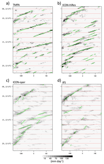 Hovmöller diagrams of three-hourly mean precipitation for the period 8 August 2016 00 UTC–22 August 2016 00 UTC over West Africa (10° N–15° N, 16.5° W–15° E, land only): (a) TRMM Multi-satellite Precipitation Analysis (TMPA); (b) the Icosahedral Non-hydrostatic model (ICON)-HiRes; (c) ICON-operational (oper); and (d) Integrated Forecast System (IFS). All model data were coarse-grained to 0.25° ×° 0.25°, i.e., the resolution of the observations. Green lines indicate objectively-identified westward-propagating precipitation features (see the main text for details). Horizontal lines indicate 12 UTC of every day.