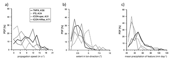 We continue our assessment of model-simulated westward-propagating mesoscale precipitation features by showing Probability Distribution Functions (PDFs) of propagation speed, sizes, and mean rain rates in Figure 2 for the whole of August 2016. The PDFs were very similar if only features having lifetimes exceeding 12 h were considered. Overall, the agreement between TMPA and ICON-HiRes was remarkable in terms of propagation speed, object size, and precipitation intensities per feature. In contrast, ICON-oper and IFS were not able to capture the observed statistics and simulated too wide, too slow, and too weakly-precipitating objects.