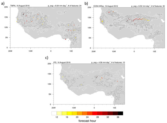 Objectively-identified precipitation features of 20 or more connected grid points with hourly rain rates exceeding a threshold of 70 mm day−1 sorted by forecast hour during which they were simulated (colors) and daily surface precipitation over land (contours) for 16 August 2016: (a) TMPA; (b) ICON-HiRes; and (c) IFS. The contour lines denote precipitation of 1, 10, 40, 80, and 120 mm day−1. The 1-mm day−1 contour is shown in white. The average precipitation is shown at the top of each panel.