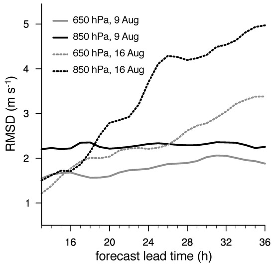 where min(RMSD(x)) and max(RMSD(x)) denote the minimum and maximum spatially-averaged RMSD-values for a given wind field x during one 24-h forecast. compares ICON-HiRes to IFS. Following Equation (1), the evolution of the RMSDs on 9 and 16 August (Figure 4) was associated with low and high -values, respectively. We also compared the operational ICON-oper to the IFS forecasts in the same manner ().