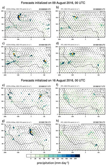 An example of the evolution of the RMSD of total wind speeds at 650 and 850 hPa (10° N–15° N) over the forecast cycles of two days (9 and 16 August 2016) is given in Figure 4. In the forecasts initialized on 16 August 2016, 00 UTC (dashed lines in Figure 4), the MCS-identification algorithm detected 30 features in ICON-HiRes and just 10 in IFS ( mm day−1). In ICON-HiRes, a series of small precipitation clusters formed at about 15 h of forecast lead time in the northeastern part of the domain and organized into a large squall line structure propagating westward throughout the remainder of the forecast. No mentionable mesoscale precipitation structures were simulated by IFS at any point during this forecast. The RMSDs of both wind fields increased over the entire duration of the forecasts (Figure 4). The corresponding spatial structures of the simulated precipitation and wind fields at 850 hPa at two forecast snapshots (17 and 30 h of forecast lead time) are shown in Figure 5e–h. The impact of the MCS simulated in ICON-HiRes on the large-scale circulation was evident and explained the increase in RMSDs over time (Figure 4).