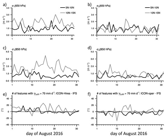 We show daily resolved time series of (650 hPa) and (850 hPa) computed for every day of August 2016 over land areas and two latitudinal bands, 5° N–10° N and 10° N–15° N, in Figure 6a,c, respectively. The difference in the numbers of objectively-identified mesoscale precipitation features with mm day−1 is shown in Figure 6e. The time series of of both wind fields for the 5° N–10° N subdomain (black lines in Figure 6) showed low temporal variability, which was consistent with the generally small number of identified MCSs in both forecasts in that region (cf. Figure 6c). In contrast, considering the 10° N–15° N band, we found larger values of with pronounced day-to-day variability. More importantly, tended to be smaller during periods when the difference in identified features was also small (e.g., 7–11 August, 19–21 August, 27–31 August; Figure 6c) and vice versa. This indicates that the better representation of MCSs in ICON-HiRes was able to project on the large-scale flow, even given the use of a limited area domain and of 24-h forecast. Note that the overall evolution of the time series was similar for the wind fields at both height levels, suggesting that explicitly-simulated convection had a systematic effect on the simulation of lower and middle troposphere dynamics alike.