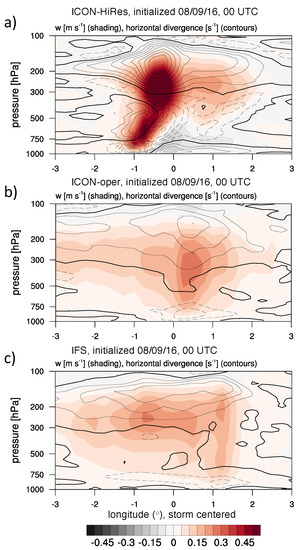 Storm-centered zonal cross-sections of vertical velocity (m s−1) (shading) and horizontal divergence (s−1) (contour lines; positive thin solid, zero line thick solid, negative dashed; regular spacing of 2 × 10−5 s−1): (a) ICON-HiRes; (b) ICON-oper; and (c) IFS. The fields are 2° meridionally averaged.