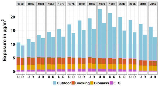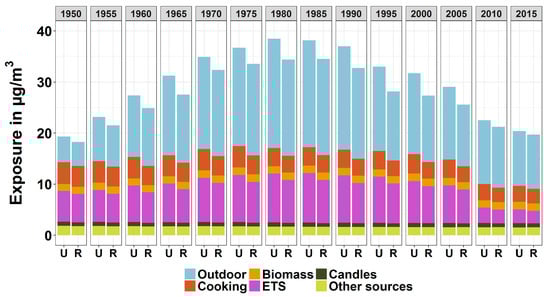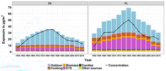 Moreover, a sharp decrease of exposure stemming from ETS in 2010 for both countries can be observed. The reason behind is the measures that were taken in European countries for tobacco control, including the smoking bans in public places and at workplaces []. However, the ETS was still responsible for 17% and 12% of the average exposure in 2015 in Poland and Germany respectively. This value even amounted 36% and 27% in 1950 when the contribution made by outdoor air was relatively small.