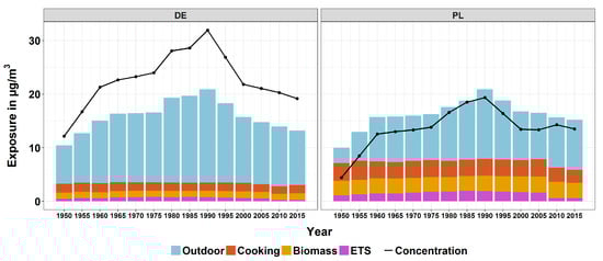 Despite the similarities stated above, an apparent gap of the exposure level between the two countries can be observed. Generally, the exposure in Poland is almost twice that of Germany. First of all, the background concentration in Poland was obviously higher than that in Germany, especially between the 1980s and the 1990s. The extremely high PM2.5 ambient concentration in Poland was mainly resulted from its overwhelming reliance on lignite and hard coal in the energy section compared other countries []. Since Poland became a member state of the European Union in 2004, this issue has been highly addressed and the government has endeavoured to comply with EU directives []. The effectiveness of the measures taken (e.g., renewal of the outdated power plants and construction of new power plants mainly using gas or other renewable energy) can be reflected by the drop of the outdoor PM2.5 concentrations since the 2010s.
