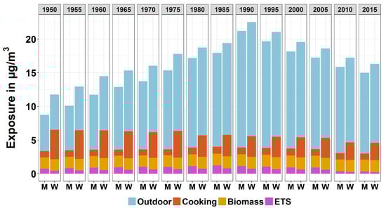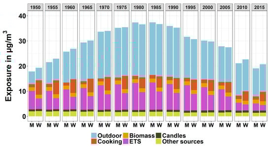 Very large gaps of exposure owing to ETS and cooking can be seen between women and men. Basically males experienced a higher level of exposure due to ETS as a result of the higher prevalence of smokers and average cigarette consumption []. In contrast, the exposure stemming from cooking of women was apparently higher than that of men, especially for the earlier time periods. The MTUS data shows that in 1960 women spent on average 116 min on cooking per day, which was almost 10 times that of men (12 min).
