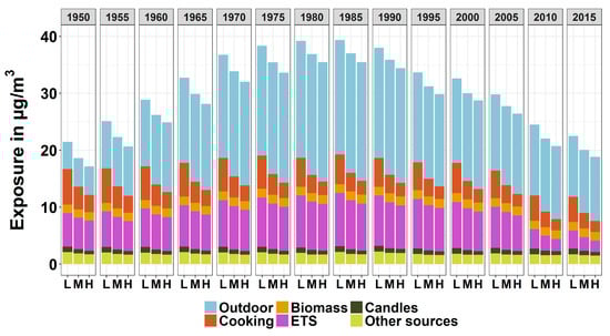 Population-weighted arithmetic mean PM2.5 exposure by source and income level for European countries from 1950 to 2015. The “L”, “M” and “H” stand for the “Low”, “Median” and “High” level of income.
