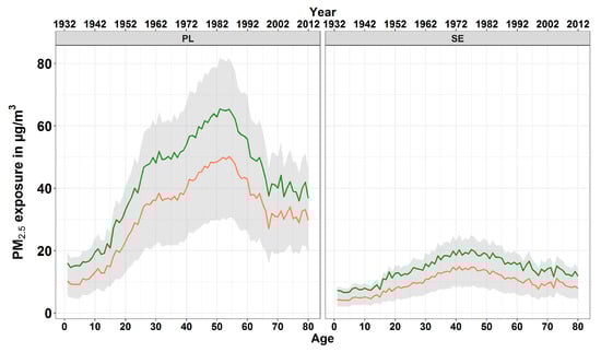 Temporal course of the lifelong exposure to PM2.5 for an 80-year-old male from Poland and Sweden. The green line, red line and grey ribbon represent the mean, median and range of 25th to 75th percentile of the exposure level.