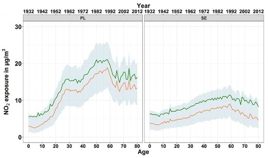 Temporal course of the lifelong exposure to NO2 for an 80-year-old male from Poland and Sweden. The green line, red line and grey ribbon represent the mean, median and range of 25th to 75th percentile of the exposure level.