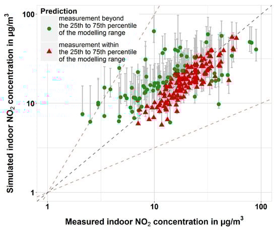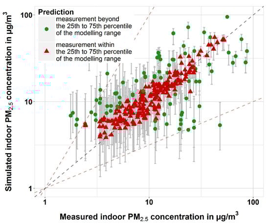 As stated previously, the measurement data from EXPOLIS were employed to validate the parameters of mass-balance model for dwellings. The estimation is considered “good performance” if the monitoring indoor concentration is within the range of 25th to 75th percentile of the predicting result. Multiple rounds of data collection and adjustment have been conducted and the results of validation are presented in Figure 12 and Figure 13. 70% (258 out of 370) and 65% (172 out of 265) of the dots for PM2.5 and NO2 are within the acceptable range.