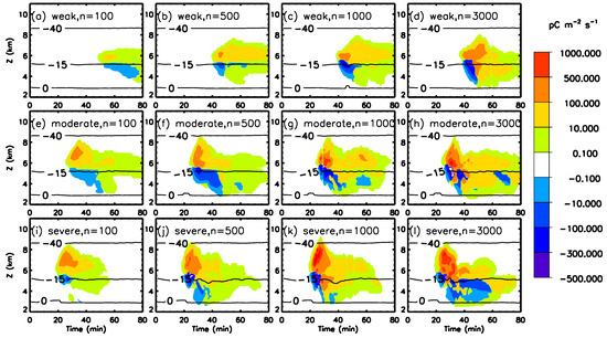 | Thundercloud Intensity | N0 (cm−3) | Non-Inductive Charging Rate (pC m−2 s−1) | Inductive Charging Rate (pC m−2 s−1) | ||