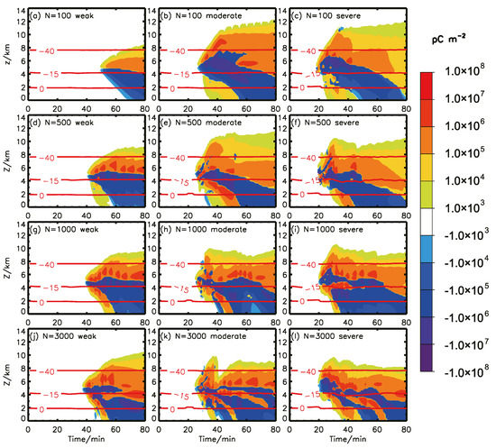 - Mansell, E.R.; Macgorman, D.R.; Ziegler, C.L.; Straka, J.M. Charge structure and lightning sensitivity in a simulated multicell thundercloud. J. Geophys. Res. Atmos. 2005, 110, D12. [Google Scholar] [CrossRef]