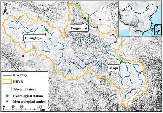 The HRYR, located in the eastern region of the Tibetan Plateau, is widely known as the “water tower” of the Yellow River, as it accounts for only 15% of the entire Yellow River basin area but contributes approximately 38% of the total flow [18]. In recent years, the HRYR has been suffering critical eco-environmental problems, including declining groundwater levels, shrinking of lakes and wetlands, thawing of glaciers and permafrost, degradation of vegetation health, and decreasing runoff [19]. Such changes in hydrological conditions could have an important impact not only on the local environment and socio-economic development but also on conditions in downstream areas. Therefore, it is critical that we accurately simulate hydrological processes and, in particular, the response of runoff to climate change in this region.