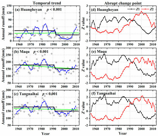 Temporal trends (a–c) and abrupt change points (d–f) based on the Mann-Kendall (M-K) abrupt change test for the annual runoff time series during the period of 1956–2012 for the Huangheyan, Maqu, and Tangnaihai stations, located at points across the HRYR. The white circles show annual runoff values (in a–c), the green and blue lines (in a–c) show the long-term linear tendency and the 5-year moving average for the annual runoff, respectively. The black line (in a–c) shows the long-term average runoff for the periods before and after the year identified by the M-K abrupt change test. Z1 and Z2 (in d–f) are confidence lines at a significance level of p = 0.05. The abrupt change point according to the M-K test lies at the intersection between these lines.