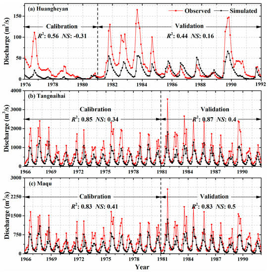 Monthly runoff simulations compared to observations for the calibration period (1976–1980 for Huangheyan; 1966–1980 for Tangnaihai and Maqu) and the validation period (1981–1991) without the inclusion of elevation bands.