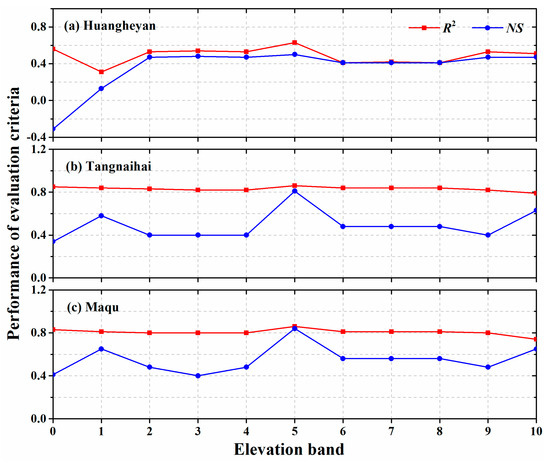 Performance of evaluation criteria (coefficient of determination (R2) and Nash–Sutcliffe coefficient (NS) values) for simulations with different numbers of elevation bands during the calibration period (1976–1980 for Huangheyan; 1966–1980 for Tangnaihai and Maqu).