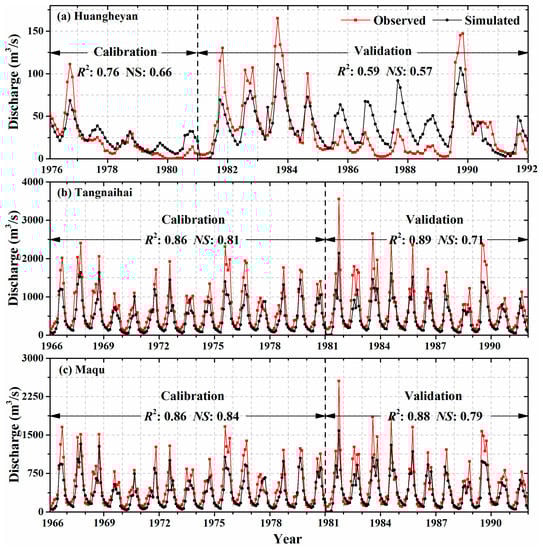 Monthly runoff simulations compared to observations for the calibration period (1976–1980 for Huangheyan; 1966–1980 for Tangnaihai and Maqu) and the validation period (1981–1991) with five elevation bands.