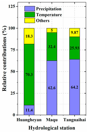 Among the effects of climate change on runoff, temperature and precipitation are two important meteorological factors affecting hydrological processes [18]. Table 4 and Figure 7 show the relative contributions of precipitation and temperature to changes in the observed runoff between 1992 and 2012 in the HRYR. Runoff was more sensitive to precipitation variations at the Tangnaihai and Maqu stations, while it was more sensitive to temperature variations at the Huangheyan station. Because the average elevation of the area around the Huangheyan station is higher than the average elevation around the other two stations, the Huangheyan station region includes large areas of glaciers and frozen soil; therefore, increased temperatures around this station can exacerbate the degradation of permafrost and the melt of glacial snow cover [50], which can lead to significant changes in regional ecosystems and water cycles [51,52]. In addition to temperature and precipitation, other climate variables such as net radiation, wind speed, and relative humidity can also affect runoff changes. All of them could act on runoff by altering precipitation and temperature. If we consider Tangnaihai station, which is located at the outlet of the HRYR, as an indicator of the basin-scale dynamics, all in all, we can conclude that across the whole HRYR, precipitation played a dominant role in runoff change during the variation period (64.2%), although the impacts of temperature on runoff changes (25.93%) should certainly not be ignored.