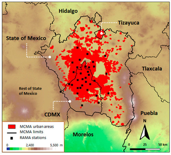 Mexico City has undergone massive transformations in urbanization and demographics throughout its history [10]. The population of the Valley of Mexico went from less than 2 million inhabitants in 1940 to more than 21 million in the year 2016, and the urban area increased from about 120 km2 to 7585 km2 during the same period. The population growth and the urban expansion pushed the city beyond Mexico City and into the State of Mexico as well as some parts of the State of Hidalgo. Currently, the MCMA includes 8.8 million inhabitants in Mexico City occupying an area of 1485 km2, 12.5 million inhabitants in the 59 municipalities of the State of Mexico covering an area of 6000 km2, and 130,000 inhabitants in the municipality of Tizayuca in the State of Hidalgo in an area of 100 km2 (see Figure 1) [11].