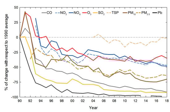 Figure 3 shows the percentage of change of the annual average concentration relative to the annual average of 1990 for each of the main air pollutants in the MCMA (for PM2.5, the reference is the annual average of 2004, since PM2.5 measurements started in 2003). The figure shows that after more than three decades of comprehensive air quality management programs, Mexico City has made important advances to reduce air pollution. The atmospheric concentrations of Pb, SO2, and CO have significantly reduced and are below the current air quality standards. However, although O3, PM10, and PM2.5 concentrations have also decreased substantially, they are still at levels that are above the respective air quality standards. Furthermore, no declining trend for O3 and PM2.5 has been observed since 2006, and several severe pollution episodes in recent years suggest that their concentrations could be increasing [24].