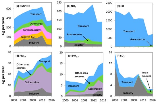 Emissions time series (2000–2016) by sectors for: (a) non-methane volatile organic compounds (NMVOCs), (b) NOx, (c) CO, (d) PM10, (e) PM2.5, and (f) SO2 obtained from the official MCMA emissions inventory [25]. The emissions presented here are lumped in major sectors.